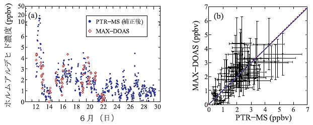 図2 2006年6月,中国泰山山頂での集中観測時のPTR-MSとMAX-DOASによって測定されたホルムアルデヒド濃度の(a)時系列変化と(b)相関図。(b)の青い実線が回帰直線,赤の点線はy=xの直線。(拡大画像)