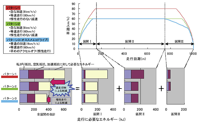 パターン1は,法定速度(60km/h)を超え80km/hまで加速しているために,60km/hで等速走行しているパターン2に比べて,区間Ⅰでは加速抵抗に対して,区間Ⅱでは空気抵抗に対して必要なエネルギーがより大きくなります。また,パターン3は,パターン2に比べてゆっくりした加速ですが,区間Ⅰでは必要なエネルギーにあまり違いはありません。しかし,減速時の早めのアクセルオフによって,区間Ⅲでは惰性走行を行い,より長い距離をエネルギーを必要とせずに走行しています。
