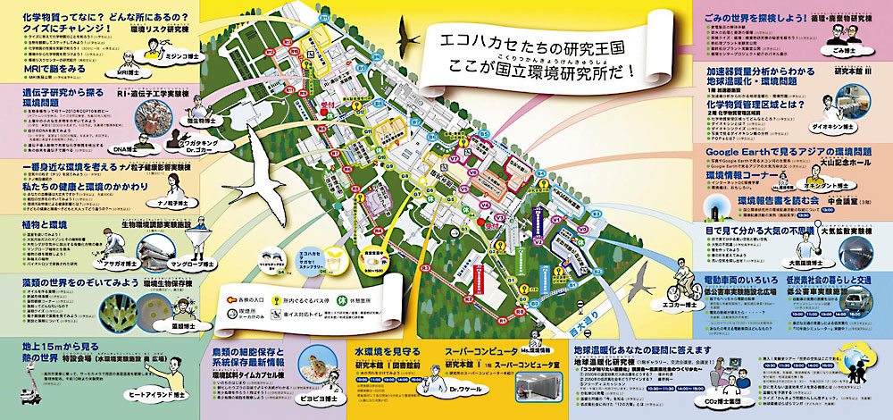 夏の大公開のメインテーマは「さあ,エコハカセたちに会いに行こう!」。現場を支える研究者個人にフォーカスを当ててポスターやプログラムを作成しました。当日は地球温暖化,ゴミ・リサイクル,大気や水の汚染,化学物質による健康影響など,様々な研究分野の“エコハカセ”たちが環境問題の「なぜ?」にお答えしました。普段はご覧いただけない施設の公開,講演会,展示,体験イベントなどの多様な企画により,来場者の皆様には研究所の職員・研究者がどんなことをしているのか,環境問題の科学的な側面について楽しくご理解いただけたと思います。