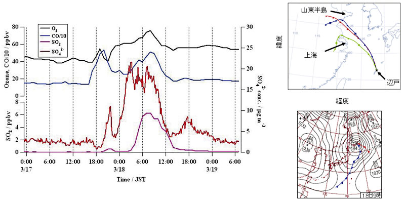 図1 2005年辺戸ステーションで観測した物質の濃度変動(左)と3月18日の後方流跡線図(右上)および天気図(右下)