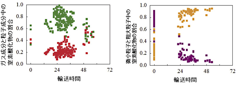 左)ガス成分(緑)と粒子成分中(赤)の窒素酸化物の割合。赤い点で示した粒子成分中の窒素酸化物が輸送時間とともに増加した。右)微小粒子中(紫)と粗大粒子中(橙)に含まれる窒素酸化物の割合。橙色の点で示した粗大粒子中の窒素酸化物が輸送時間とともに増加した。両図とも輸送時間ゼロの点は中国での観測結果である。また輸送時間は辺戸ステーションを基点とした後方流跡線解析から求めた。
