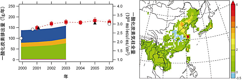 図2 (左)逆推計モデル(本研究による2005年と,Yumimoto et al. による2001年の▲),排出インベントリー(Streets et al.: 2000年, 2001年, 2006年の○;Ohara et al.: 2000-2003年のカラーグラフ。青:民生セクター,橙:輸送セクター,緑:工業セクター,ピンク:発電セクター)による中国からの一酸化炭素排出量の推移と,MOPITT衛星センサー(赤線)によって観測された中国上空における一酸化炭素の気柱全量の推移[Tanimoto et al., 2008]。