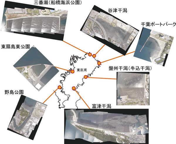 調査は、グリーンタイドの発生状況や地形学的な特徴が異なる東京湾内の7ヵ所の浅海域(図2:野島公園、東扇島東公園、三番瀬、谷津干潟、千葉ポートパーク、盤州干潟、富津干潟)で、2009年10月から秋、冬、春、夏、と季節ごとに実施し、アオサの現存量と種構成比の季節変化を調べました。種構成比については、アオサは形態による分類が困難であることから、遺伝子解析によって種の同定を行いました。