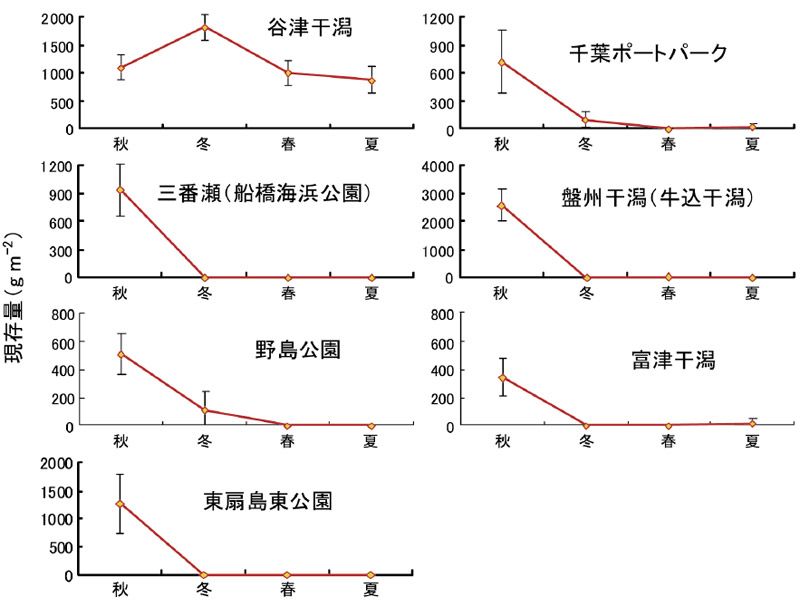 図3 各調査地点におけるアオサ現存量の季節変化 (現存量は1m2 当たりの湿重量,繰り返し計測12 回の平均値と標準偏差を記しています。)(拡大表示)