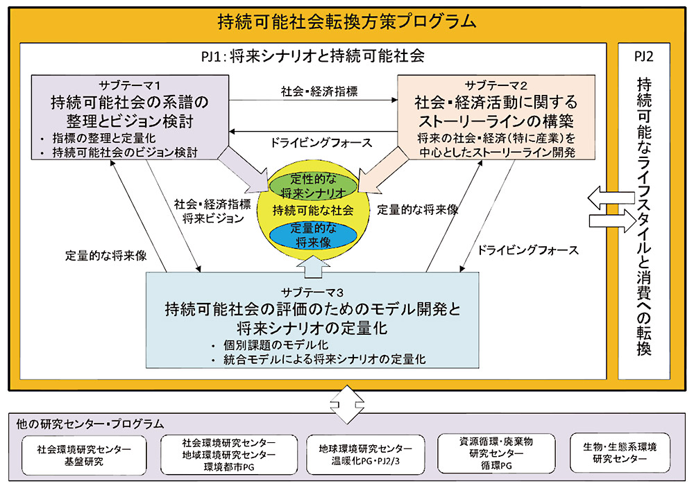 ③持続可能社会の評価のためのモデル開発と将来シナリオの定量化 : ①の情報をもとに持続可能社会を構成する社会・経済、気候変動や循環、水資源などの個々の環境問題を対象とした個別のモデル開発を行い、②の社会・経済を対象とした将来像のストーリーラインに対応する環境の変化を定量的に分析する。統合モデルを用いて、環境、社会、経済を包括的にとらえた持続可能な社会の将来像を定量化するとともに、ロードマップを作成する。