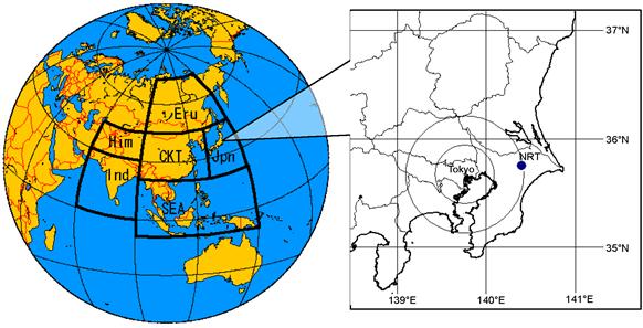 図2.タグを付けた6領域(Jpn, CKT, SEA, Eru, Him, Ind) と成田(NRT)の位置。