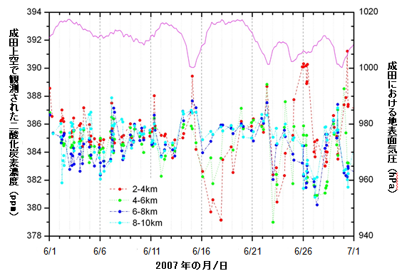 図4.2007年6月に観測された成田上空のCO2濃度(左軸:高度2-4 km●、4-6 km●、6-8 km●、8-10 km●)と地表面気圧(右軸:—)。