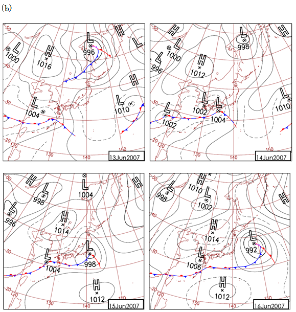 図5. 2007年6月13日〜16日の、(a)高度約3kmにおける大気中CO2濃度のモデル計算値および(b)地上天気図。((a)のCO2濃度は中央値を基準とした相対濃度(ppm)で表した。)