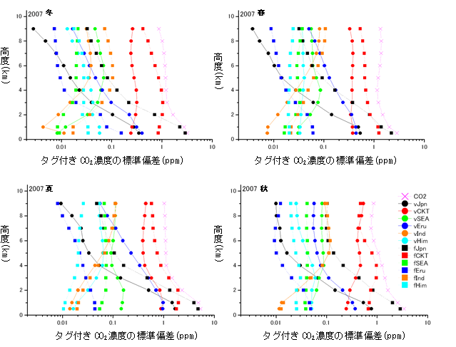 タグ付きシミュレーションの結果(図3:横軸は、対数で表現されていることに注意)から、成田上空のCO2濃度の総観規模の変動(ピンクの×)のうち、大気境界層内では日本のCO2放出・吸収(黒の●と■)の影響が大きいものの、自由対流圏では一年を通じて、東アジアに由来するCO2の放出や吸収(赤の●と■)に最も影響を受けていることがわかりました。春季に上部対流圏(高度およそ8〜10 km)で見られた総観規模の変動幅の増加は、春季に卓越する東アジアからの汚染大気の吹き出し(アウトフロー)(*5)により上部対流圏に運ばれたCO2が偏西風に乗って日本上空を通過する様子を捉えたと考えられます。