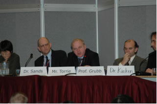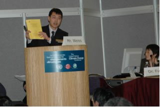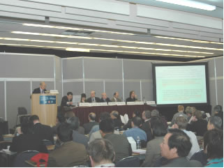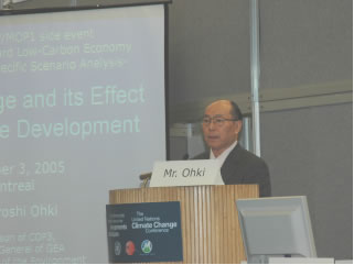 2005年12月12日 気候変動枠組条約締約国会合及び京都議定書締約国会議 国立環境研究所のサイドイベントの様子 大木元環境大臣(COP3議長)の挨拶 西岡理事によるイントロダクション 会場からの質問を受けるカナダのTorrie氏 藤野主任研究員によるプレゼンテーション 休日夜にもかかわらず立ち見も出る会場内 パネル終了後も質問・議論が続く