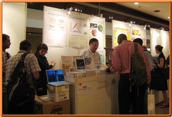 展示スペースは主会議場の1階と2階のロビー部分に設けられており、国環研のブースは2階ロビーの一角にあります。今回は展示用スペースが限られている上に参加希望が多かったせいか、現場での交渉で2ブース確保できた前回とは異なり、かなり限られたスペースでの展示となりました。それでもポスターを貼り出し、カウンターの上に資料をレイアウトし始めると、いろいろな方にお立ち寄りいただきました。近くにブースを構えていた米国のコロンビア大学の方からは、統一感のあるポスターと資料のディスプレイに「すばらしい」との言葉もかけていただきました。