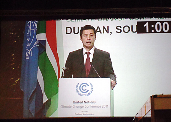細野大臣は、冒頭で、3月の東日本大震災及び原発事故に触れ、各国からの支援に対して謝意を表しました。日本国民は、このような国難にあっても、 温暖化問題に積極的に取り組み、世界に貢献する意欲を失っていないとしました。地球規模での行動が緊急に必要であるとして、世界の平均気温上昇を2℃にと どめることを認識し、2050年までに世界全体の温室効果ガスの排出量を少なくとも半減させることを国際社会共通の長期目標とすべきであると強調しました。この目標を実現するためには、すべての主要国が参加する、公平かつ実効性のある新たな法的枠組みが必要であると述べました。そして、①カンクン合意の 実施、②新たな作業部会の設立、③京都議定書第1約束期間後、新たな枠組みができるまでの間、各国が着実に削減努力を進めること、の3点をダーバン会合の 成果とすべきであるとしました。そして、京都議定書の意義を評価し、第1約束期間の目標の達成に邁進するとしましたが、第2約束期間については、将来の包括的な枠組みの構築に資することがないため、これに加わらない意向を改めて表明しました。ただし、カンクン合意の実施や将来の枠組みの構築にあたり、議定書の下で発展してきたルールやメカニズムを活用することも重要であると述べました。