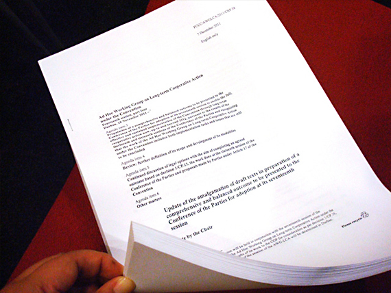 同じく今日の午前中、AWG-LCAのコンタクトグループが開催さ れ、リーフシュナイダーAWG-LCA議長は、統合文書の改訂版(写真2)を提示しました。共有ビジョン(長期目標など)や合意の法形式など、事務レベル の交渉が膠着状態にあるために閣僚級協議からのインプットを必要とする事項がたくさんあるようです。これらについて、バランスのとれた合意ができるかを心 配している国に対して、リーフシュナイダー議長は、閣僚級協議ではパッケージとして包括的に議論するので、心配する必要はないと述べました。