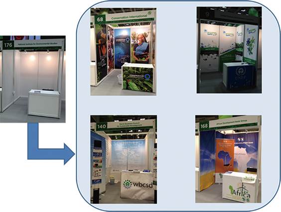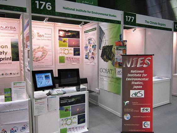 参加方法の2つ目として、展示ブースを設置することや、その訪問があります。会場内には、政府、国際機関、NGO等によるたくさんの展示ブースが並んでいます。ブース設置を希望する各団体に与えられるスペースは狭いのですが、各団体が事業や研究成果等のアピールのために工夫をこらして展示しています。各ブースでは、成果の報告書等(近年は、USBメモリやCD-Rなどの形式で配布することが多いです)やグッズ(エコバッグやバッジなど)をもらったり、担当者に質問したりすることができます。