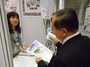 朝山由美子特別研究員は、地域レベル、国レベルの取り組みの事例として、2050年までに2度目標を達成するために、アジア各国がどうCO2を削減しながら、Co-benefitを達成することができるか、BAUシナリオとの比較を示したアジアLCSシナリオ開発研究に取り組んでいること、このプロジェクトではアジア低炭素社会の実現に向けたビジョンを描き、望ましい社会の実現に向けて、いつまでにどのようなアクションを取るべきか、各国政府、民間企業、市民、国際機関がどのようなとりくみをすべきかについてロードマップの策定も合わせて行っていることが特徴であることを紹介しました。大臣は、「アジア低炭素シナリオ冊子紹介」やタイの低炭素社会シナリオ報告書を手に取り、熱心にご覧になりました。