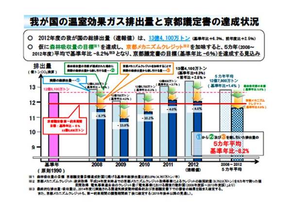 環境省報道発表資料(http://www.env.go.jp/press/press.php?serial=17394)によると、昨年度の日本の温室効果ガスの総排出量は、13億4,100万トン(CO2換算)で、これは基準年比6.3%増))、前年度比2.5%増となっています。仮に森林吸収量の目標(1990年比3.8%)が達成され、また、京都メカニズムクレジットを加味すると、京都議定書第1約束期間(2008~2012年度)平均で基準年比8.2%減となります。日本は、気候変動対策の第一歩である、京都議定書第1約束期間の目標を達成する見込みです。