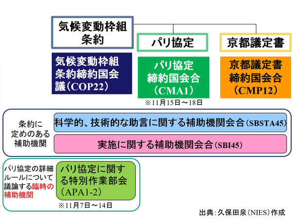 報道では「COP22が始まります」などとひとまとめにして紹介されることが多いかも知れませんが、今回、マラケシュでは、6つの会議が開催されます。