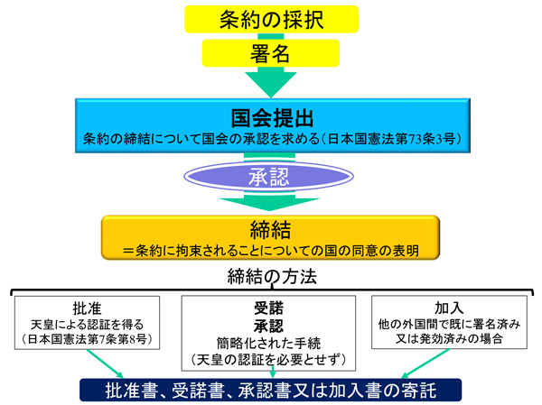 日本が多数国間条約を締結する場合の手続きの流れを示します(図)。「条約を締結する」とは、その条約に拘束されることについて国が同意することを意味します。