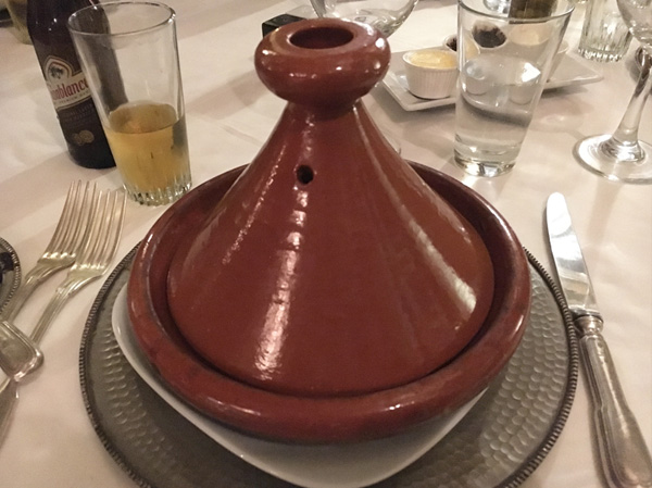 今日は、こちらに来てからよく食べているタジンを紹介します。北アフリカ地域の煮込み料理です。日本でも、何年か前に流行しましたね。タジンとは、とんがり帽子のような形のふたが特徴の陶製の鍋(タジン鍋)を使って、肉(羊肉、鶏肉、牛肉、ウサギ肉、魚、牛挽肉のミートボールなど)と数種類の野菜に、香辛料をかけて煮込んだものです。