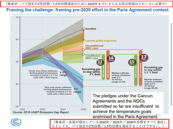 なぜこのような対話が必要なのでしょうか?それは、パリ協定に描かれた未来、つまり、産業革命以降の世界の平均気温上昇を2℃/1.5℃に抑えるということを実現するためには、2020年までの、そして、2020年以降の、世界全体の温暖化対策のレベルを大幅に引き上げていかなければならないからです。これは、今、パリ協定が乗り越えていかなければならない大きな課題です。現在、各国がカンクン合意の下で提出している2020年の排出削減目標、そして、パリ協定に基づき提出を予定している2025年/2030年の温暖化対策の目標がすべて達成されたとしても、2℃目標の達成にはほど遠いことがわかっています(図)。