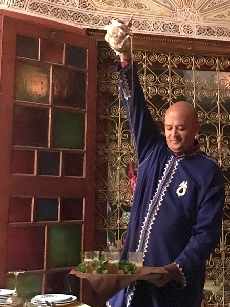 モロッコのミントティーの作り方を紹介しますね(いろいろなレシピがあるようです)。緑茶、たっぷりの生のミントと大きな角砂糖に水を加え、15分ほど煮出します。銀製のポットから各自のグラスに注ぐ時は、高い位置から勢いよく泡立てながら注ぎます(写真2)。グラスにミントの葉を直接入れる場合と、入れない場合とがあります。甘さも苦さも強く、くせになる味わいです。