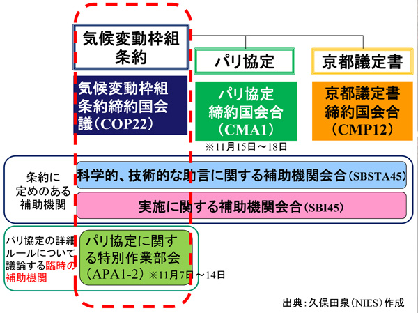 パリ協定に関する特別作業部会(APA)とは、パリ協定の詳細ルールについて議論する会議です。APAは、気候変動枠組条約締約国会議(COP)の下に設置されています(図の赤点線枠内)。APAがパリ協定締約国会合(CMA)の下に設置されているわけではないことに注意が必要です。