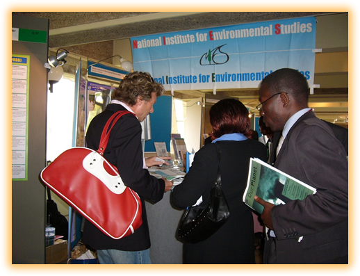The twelfth session of the Conference of the Parties to the Climate Change Convention (COP12) and the second meeting of the Parties to the Kyoto Protocol (COP/MOP2) is being held at the United Nations Office at Nairobi from November 6 to 17 in Nairobi, Kenya. During the duration of this event, the National Institute for Environmental Studies (NIES) will have a booth that introduces the activities of the institute with a focus on climate change. Also, with the cooperation of the Ministry of the Environment (Japan) and the Department for Environment, Food and Rural Affairs (United Kingdom), it will hold a side event entitled "Global Challenges Toward a Low-Carbon Society (LCS) Through Sustainable Development (SD)" on November 8. The booth exhibits are taking place in four locations within the two-storey building that is serving as a venue for this event. The NIES booth is on the second floor of the building, in the green zone, an area where the meeting participants tend to walk by. The booth has been flooded with participants since it was set up. In fact, at one point, the exhibitors had to stop setting up the booth before they were finished in order to answer questions.