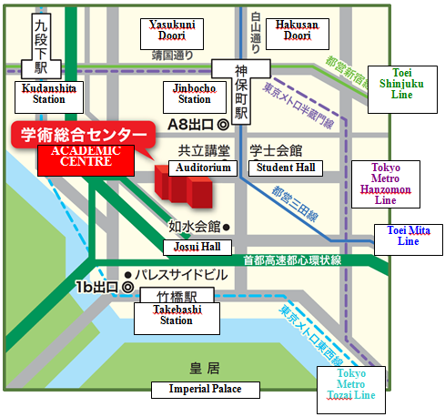 Academic Centre: 3 minutes on foot from Jinbocho station or 4 minutes on foot from Takebashi station