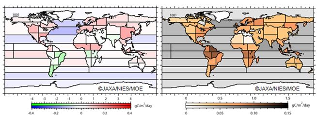 The Three Parties will publicly distribute the monthly estimates of net CO2 fluxes (Note 1) for 64 sub-continental regions from June 2009 to May 2010. These flux values were estimated from the global distribution of CO2 concentration retrieved from GOSAT observational data and ground-based CO2 monitoring data (Note 2), using an atmospheric tracer transport model (Note 3) and a Bayesian inverse modeling scheme (Note 4). Further explanations of the net CO2 flux estimation technique are found in the appendix to this document (attached). As examples, the net CO2 fluxes for July 2009 and January 2010 are presented in Figure 1.