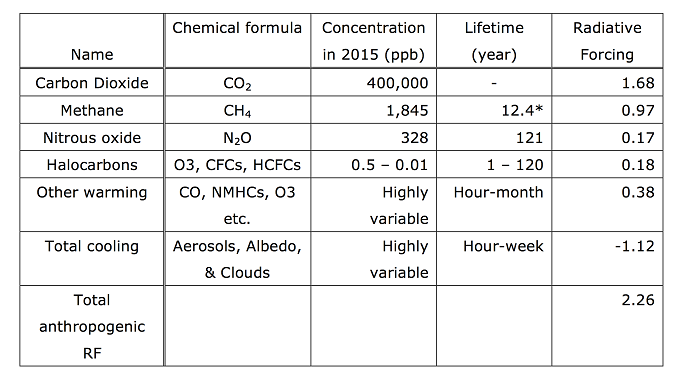 *2 Greenhouse gases: Carbon dioxide (CO2) and methane (CH4) are the two most prevalent anthropogenically produced greenhouse gas. Both are colorless and odorless, having large impacts on global warming. About 73% and 42% of the net anthropogenic greenhouse effect is attributed to CO2 and CH4 respectively over the period of 1750-2011. According to the IPCC 5th Assessment Report, emissions of CO2 and CH4 together contribute 78% of the anthropogenic radiative forcing increase since the preindustrial era. By sending it back to the Earth’s surface, GHGs trap heat in the atmosphere, which is measured by radiative forcing that is integrated since a pre-industrial reference period of 1750,