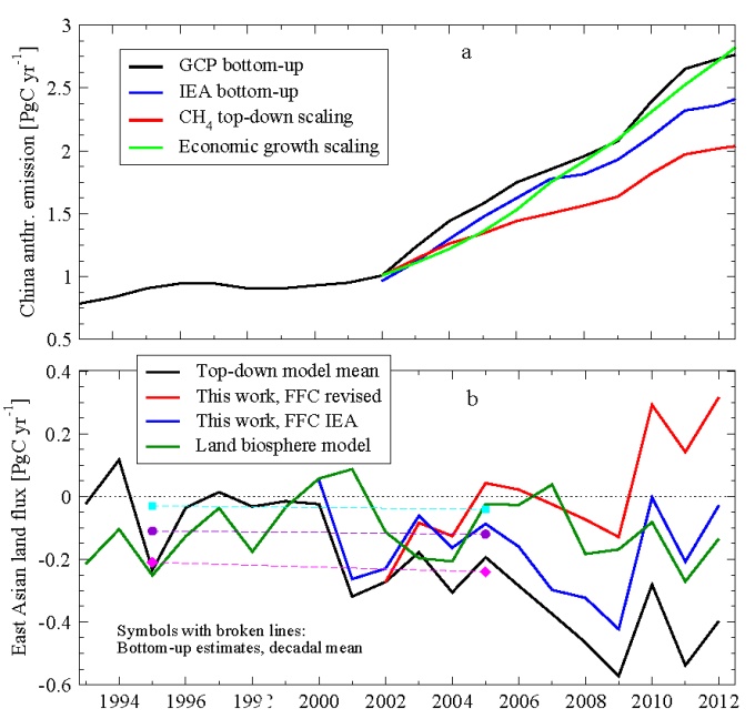| Anthropogenic CO2 emission increase during 2003-2007 has very likely been overestimated for China, which suggests estimated CO2 sink increase over East Asia (China, Japan, Korea and Mongolia) during 2002-2012 may be due to high bias in CO2 emissions from China, according to a new study by Dr. Prabir K Patra at the Department of Environmental Geochemical Cycle Research, Japan Agency for Marine-Earth Science and Technology (JAMSTEC: Asahiko Taira, President), with Dr. Tazu Saeki at the Center for Global Environmental Research, National Institute for Environmental Studies (Chiho Watanabe, President). Based on high-precision measurements of atmospheric concentration and an atmospheric chemistry-transport model*1, they estimated surface sources and sinks of CO2 and CH4 as the most significant greenhouse gases*2. Distinction between CO2 sources and sinks at regional scales is important for future predictions of atmospheric concentration and quantification of global warming as well as for greenhouse gases emission management. Presently, the sources and sinks on the Earth’s surface are calculated by country-level statistics (bottom-up modeling; Fig. 1), which are then refined with atmospheric concentrations (top-down modeling). High bias in bottom-up anthropogenic CO2 emissions seems to result in larger land CO2 sink estimates due to the top-down constraint on the total CO2 flux by the atmospheric CO2 growth rate. In addition, the scientist’s independent results from methane (CH4) inversion (as reported in press release on February 01, 2016) supported lowering the East Asian CH4 emission increase rate by 41% during the period of 2002-2012 (Fig. 2). Long-term aircraft measurements of CH4 over Sendai carried out by Tohoku University have also provided a key verification on the rate of CH4 emission increase from the East Asia region. By applying a scaling factor of 0.59, based on CH4 inversion (Fig. 2), to the rate of bottom-up anthropogenic CO2 emission growth rate for China (1.7 petagram of Carbon over a period of 2002-2012), they find no systematic increase in land CO2 uptake over East Asia during 1993-2010 or 2000-2009 (Fig. 3). No significant change of East Asian CO2 sink is in better agreement with the terrestrial biospheric model simulations that include CO2-fertlization and climate effect, and bottom-up estimation from the country reporting to the Food and Agriculture Organization (FAO) between the 1990s and 2000s (Fig. 3). These results have large implications for greenhouse gas management as per the Intended Nationally Determined Contributions (INDCs) under the Paris Agreement, contributing to efforts for reduction of greenhouse gas emissions and how the terrestrial ecosystems models are tuned for climate prediction studies. |