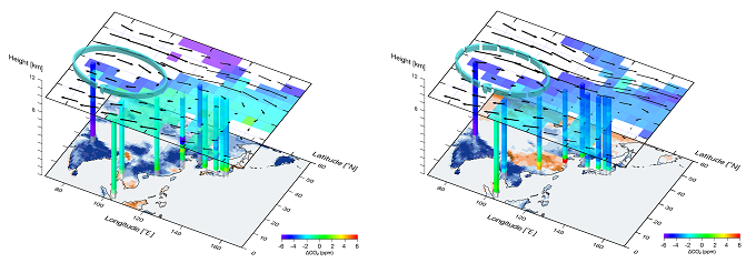This study analysed 10 years of the CONTRAIL CO2 measurement data taken over Asia Pacific. From ground-based global atmospheric monitoring networks, it is now well known that atmospheric CO2 undergoes clear seasonal variation with summertime depletion and springtime elevation (in the Northern Hemisphere) due to biospheric activity (photosynthesis and respiration), and thus northern biosphere is well recognized as a driver of seasonal cycles of atmospheric CO2. The CONTRAIL data revealed clear seasonality of CO2 over Asia that varies with latitude, longitude and altitude. In particular, we observed distinct depletion of CO2 concentration over South Asia to Southeast Asia in August to September (Figure 2). The low CO2 area was found to be confined within the Asian summer monsoon anticyclone—persistent anticyclonic circulation in upper layers of the atmosphere (above 10 km altitude) associated with the seasonally varying monsoon regime—and to be imprinted by strong CO2 uptake by vegetation in South Asia. The Asian summer monsoon meteorology efficiently conveys signals from South Asian ground vegetation upward and it propagates eventually out to the Pacific after being trapped within the anticyclone. Seasonal evolutions of CO2 uptakes in South Asia and of dynamical development and decay of the Asian summer monsoon anticyclone have remarkable impact in distributing atmospheric CO2 over Asia and to the Pacific.