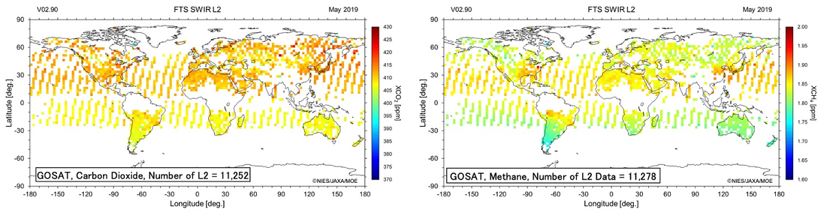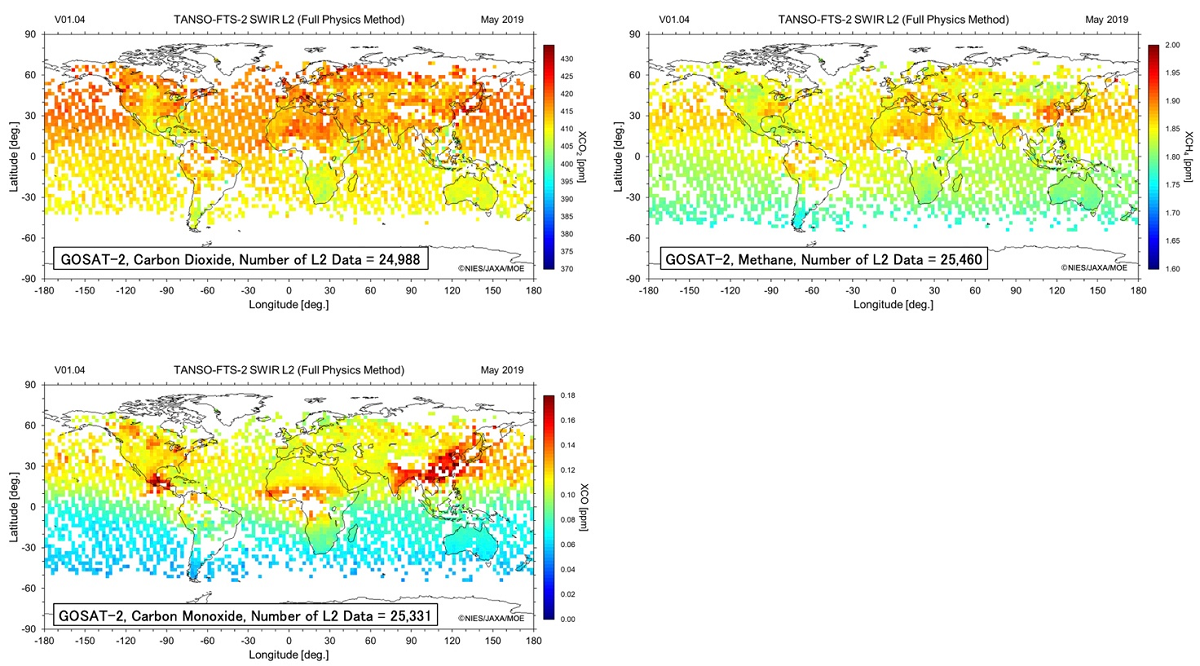 Figure 1 shows the global distributions of column-averaged dry-air mole fractions of CO2, CH4 and CO (denoted by XCO2, XCH4 and XCO, respectively) retrieved from GOSAT-2 FTS-2 data in May 2019 using the full physics method.