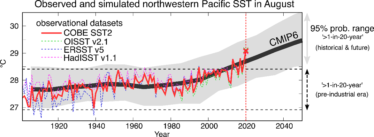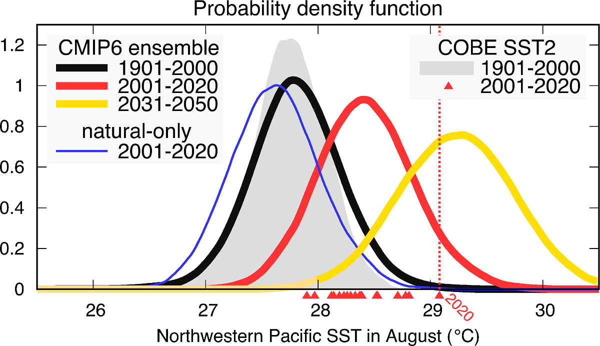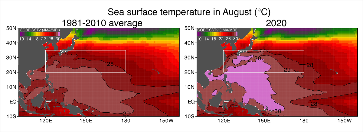 The northwestern Pacific sea surface becomes warm seasonally around August every year. However, it was unprecedentedly high in August 2020, according to the Japan Meteorological Agency and the National Oceanic and Atmospheric Administration. The extremely high SSTs exceeding 30°C, which lasted until mid-September, may have intensified tropical cyclones such as Typhoon Haisheng, causing severe damages to the East Asian countries. Although human-induced greenhouse gas emissions such as carbon dioxide have gradually warmed the northwestern Pacific Ocean since the mid-20th century, it remains unclear yet how much past human activities may increase the occurrence likelihood of such regional record-warm SSTs.
