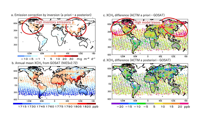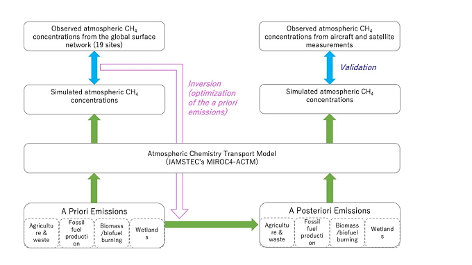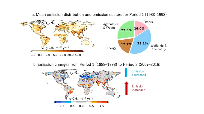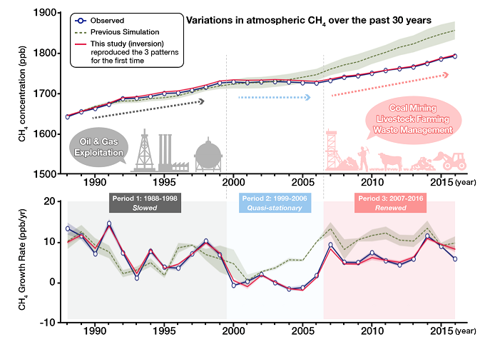 We use a well-validated chemistry-transport model for simulating CH4 concentration and estimate of regional CH4 emissions by inverse modelling for the period of 1988-2016 (※1). Our findings provide a robust set of explanations about the processes and emission sectors that led to changes in the global CH4 growth rates over the past three decades (※2), covering the three distinct periods of slowed (Period 1: 1988-1998), quasi-stationary (Period 2: 1999-2006) and renewed (Period 3: 2007-2016) phases (Figure 1). The inversion results are well validated against an independent set of extensive vertical aircraft measurements over Japan covering the three decades. We show decadal shifts in CH4 emissions toward the lower latitudes from the northern midlatitudes, relative to earlier decades (Figure 2b) and a priori estimates (Figure 3a), which can be confirmed using the global distributions of the total column CH4 (※3) observations by satellite remote sensing (Figure 3b-d).