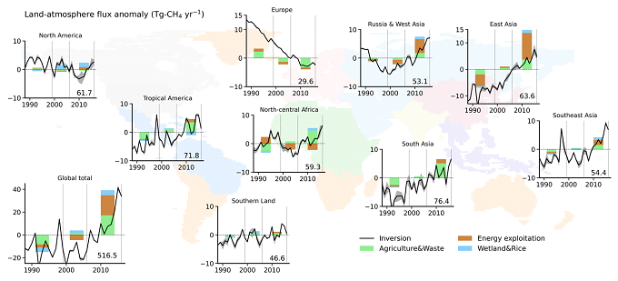 ◆ The renewed growth since 2007 is driven entirely by human activities, coal mining in China, livestock farming in South/Southeast Asia, South America, Africa regions.