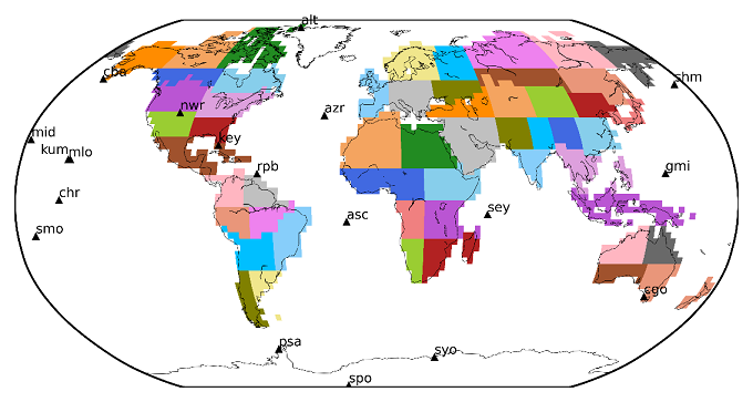 The JAMSTEC’s atmospheric chemistry transport model (ACTM) is based on the Model for Interdisciplinary Research on Climate, version 4.0 (MIROC4). The ACTM simulates CH4 concentration using prescribed meteorology, a set of surface emissions and sinks, and air chemistry for reactions. As a first step, we simulated atmospheric CH4 concentrations with the a priori emissions (Appendix Figure 1). Next the inverse model estimated a posteriori emission (optimized emissions) from 53 partitions of the global land, using the model simulated and observed CH4 differences at 19 NOAA sites (marked by black triangles) for the period of 1988-2016 (Appendix Figure 2). After that, atmospheric CH4 concentrations were simulated with the a posteriori emission for validation against aircraft and satellite measurements.