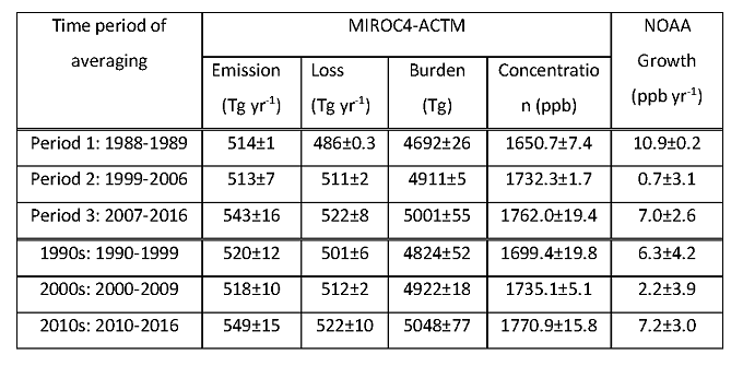 Global CH4 budget consists of decadal mean net emissions, loss by chemical reactions, atmospheric burden/concentration (1 Tg = 1012 g). The mean values for different phases of growth rates and decades are given. Ranges are 1-σ standard deviations of the annual means. Global mean CH4 growth rates are based on the NOAA report (https://www.esrl.noaa.gov/gmd/ccgg/trends_ch4/).