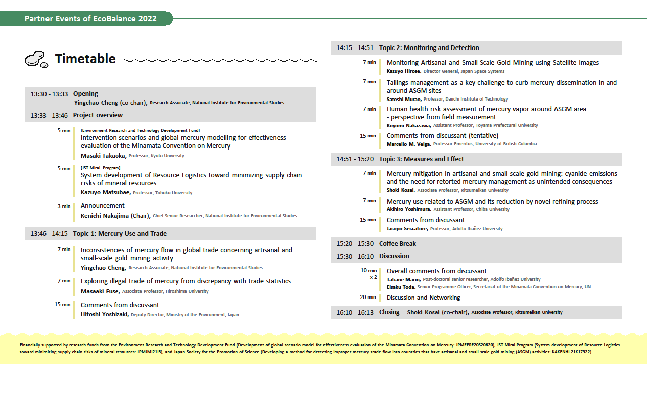 *2. This event was financially supported by the Environment Research and Technology Development Fund of the Environmental Restoration and Conservation Agency of Japan (“Development of global scenario model for effectiveness evaluation of the Minamata Convention on Mercury: JPMEERF20S20620”), Japan Society for the Promotion of Science (“Developing a method for detecting improper mercury trade flow into countries that have artisanal and small-scale gold mining (ASGM) activities: KAKENHI 21K17922”), and JST-Mirai Program (“System development of resource logistics toward minimizing supply chain risks of mineral resources: JPMJMI21I5”) of the Japan Science and Technology Agency.