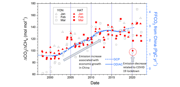 Analyzing atmospheric carbon dioxide (CO2) and methane (CH4) concentrations observed on Hateruma Island (HAT) and Yonaguni Island (YON)1), our research team, led by Yasunori Tohjima in the Earth System Division of the National Institute for Environmental Studies, had found that the variability ratio (ΔCO2/ΔCH4) in winter reflected the variations in the fossil fuel-related CO2 (FFCO2) emissions from China2, 3). The ΔCO2/ΔCH4 ratios showed a gradual increase during 2000-2010 and a marked decrease in February 2020 (Fig. 1). The former change reflected an unprecedented increase in FFCO2 emissions associated with the rapid economic growth in China, and the latter changes corresponded to the period of a severe lockdown implemented in China. Therefore, we revisited the ΔCO2/ΔCH4 ratios observed on both islands to develop a near-real-time estimation method for the temporal change in the FFCO2 emissions from China.