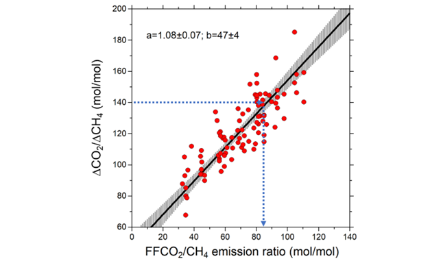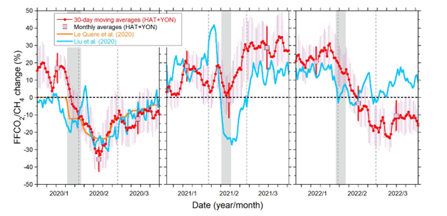 We simulated atmospheric CO2 and CH4 using an atmospheric transport model (NICAM-TM) and a full set of surface CO2 and CH4 fluxes and found a linear relationship between simulated ΔCO2/ΔCH4 ratios and FFCO2/CH4 emission ratios in China during January, February, and March (Fig. 2). Therefore, we could use this linear relationship to convert the observed ΔCO2/ΔCH4 ratios to FFCO2/CH4 emission ratios in China. Then, we calculated the change rate of the FFCO2/CH4 emission ratios compared to the corresponding averages for the preceding 9-year period (2011–2019), during which relatively stable ΔCO2/ΔCH4 ratios were observed. Under the additional assumption that there were no interannual variations in biospheric CO2 and CH4 fluxes, we can interpret the rate of change in the FFCO2/CH4 emission ratio as the rate of change in FFCO2 emissions from China. Finally, we computed the weighted averages of the estimated change rates for HAT and YON.