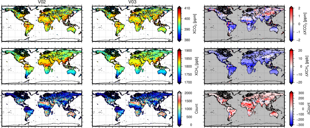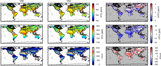 The CO2 and CH4 concentrations estimated by the updated method are planned to publish as V03.00. The increase in the data may contribute to the improve the quality of the source/sink product, which is the higher-level product. On the other hand, the V03.00 product has negative biases over the ocean. Therefore, we plan to release the bias-corrected one as V03.05. The biases are possibly due to the fitting accuracy of the spectra (*5). We will continue to improve the method through further analysis to resolve this issue.