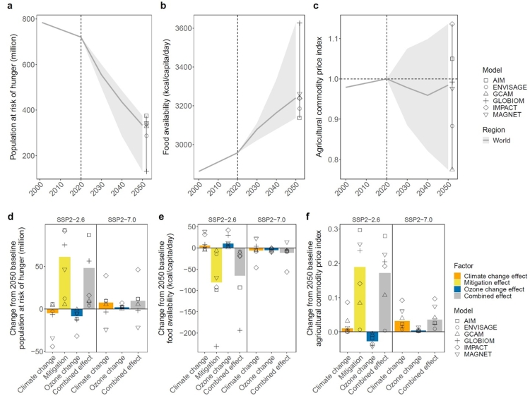 Global population at risk of hunger (a), global mean food availability (b), and food prices (c) in the baseline scenario, and, as differences from the 2050 baseline estimate, the effects of climate change alone, climate mitigation policies, and the associated ozone reduction on the global population at risk of hunger (d), global mean food availability (e), and food prices (f). The combined effect represents the sum of the effects of these three drivers. Shaded areas in (a–c) indicate inter-model uncertainty, whereas bars in (d–f) show the median across the six models. Markers denote individual model results.