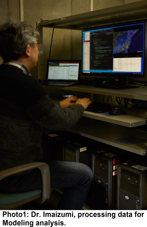 How can we know what chemicals are moving around in the environment? Chemicals are very small and, of course, not directly visible to the human eye. If they are dissolved in water or dispersed in the atmosphere, it is impossible to follow them visibly (Picture1). How then can we track them? To meet this challenge, Dr. Imaizumi uses computer models. With models like these, we can create a simulated environment on a computer and calculate the movement of chemical substances in that environment. In other words, he builds a "model environment" on the computer.
