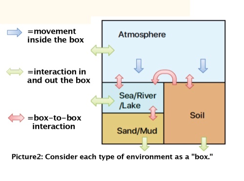 There are many different types of environments, including the atmosphere, oceans and rivers, soil, sand, and clay. Considering each as a “box”, we can calculate the movement of chemicals in and out of the box (Picture2). This is the basic concept underlying a model used for the entire environment (the model is called G-CIEMS). As the box becomes more detailed, we can expand the spatial extent of our calculations. By doing so, we can follow the movement of chemicals over a larger area and areas that have not even been surveyed. In this process, we can, for example, simulate how the seasonal concentration of pesticides used in rice fields changes in rivers or understand the movement of radioactive materials from nuclear accidents. That’s wonderful! However, each chemical varies in the ways they spread in the environment, it is important to design the “boxes” according to the natures of the chemical substances we want to learn about. It is also very important to select the environment to focus on, whether it is the entire environment, or a particular part of it, such as the atmosphere or a coastal area. Sometimes, to gain a more comprehensive understanding, we need to combine several of these factors in the model calculations.