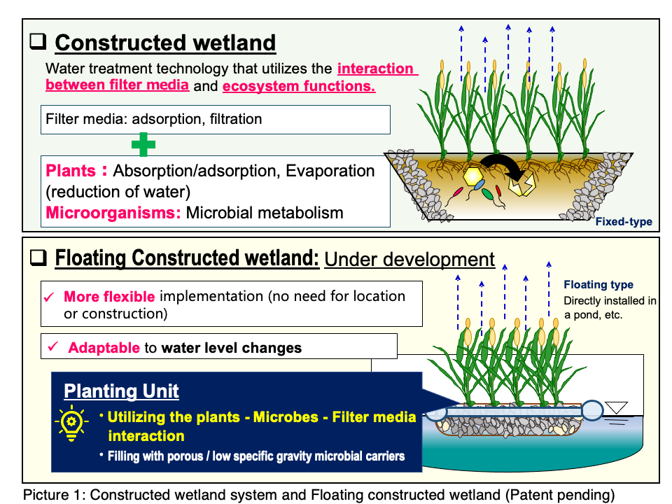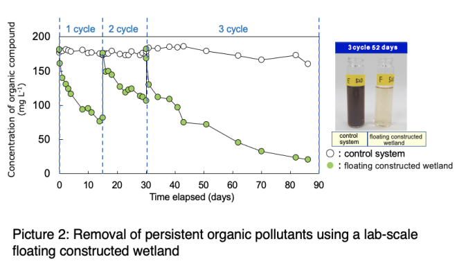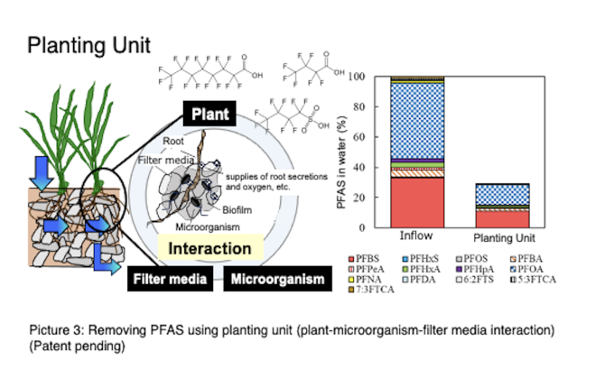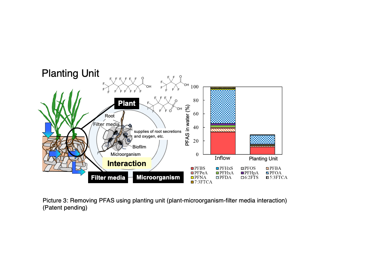 In research studies, biology-based systems capitalizing on beneficial interactions among plants, microorganisms, and filter media reduced the quantities of 13 types of PFAS in water samples. Mass balance analysis revealed that not only accumulation on filter media, nor plant adsorption and uptake, but also other actions (microbial reactions, etc.) would be involved in the measured reduction in PFAS in the plant–filter media–microorganism unit. Under optimal conditions, microbes should contribute to the efficient removal of PFAS and other pollutants from contaminated water.(Picture 3)