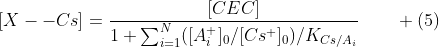 式(5)によると、競合イオンとの濃度比([A+]/[Cs+])に比べCs選択係数(KCs/A)が十分に大きい場合は分母が小さく1になるので、Cs吸着量はCECに近くなり、逆の場合は、Cs吸着量は小さくなります。