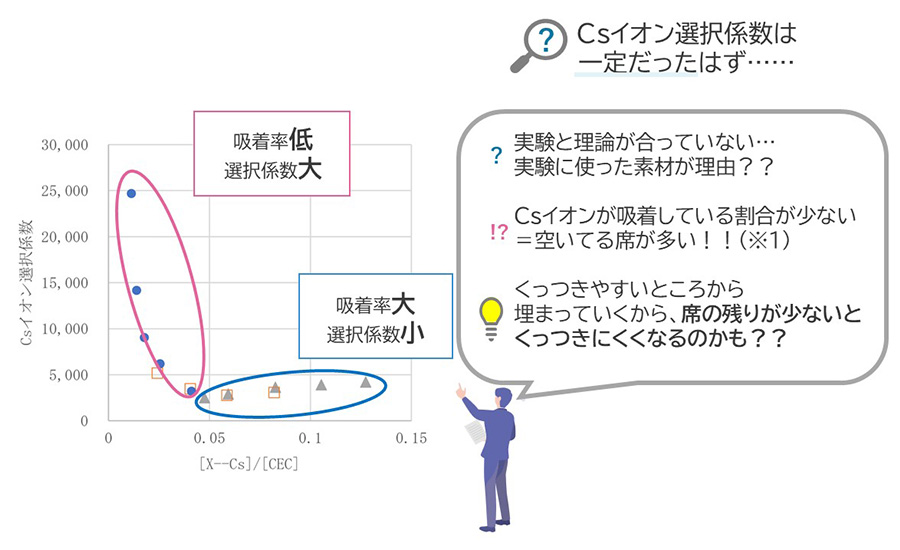 すごく単純化すると、イオン交換するはずのCsの吸着の環境条件が経時的に、あるいは先に層間に存在するイオンにより変化するということです。