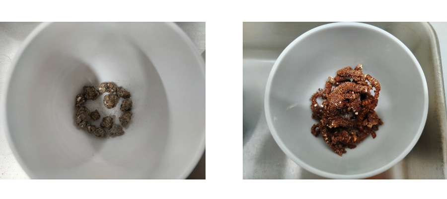 写真 福島県小野産蛭石(先崎蛭石採石所提供)と加熱による膨潤