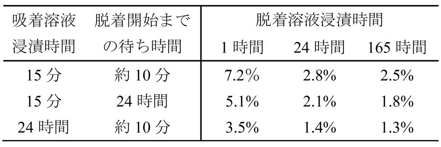 15分吸着させ、10分後に脱着させると、1時間後には7.2%が脱着しましたが、24時間では2.8%に脱着量が減り、165時間後には、さらに2.5%に減少しました。